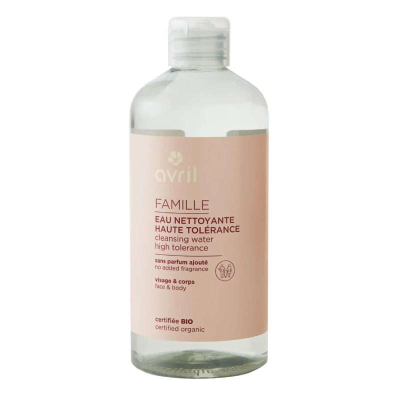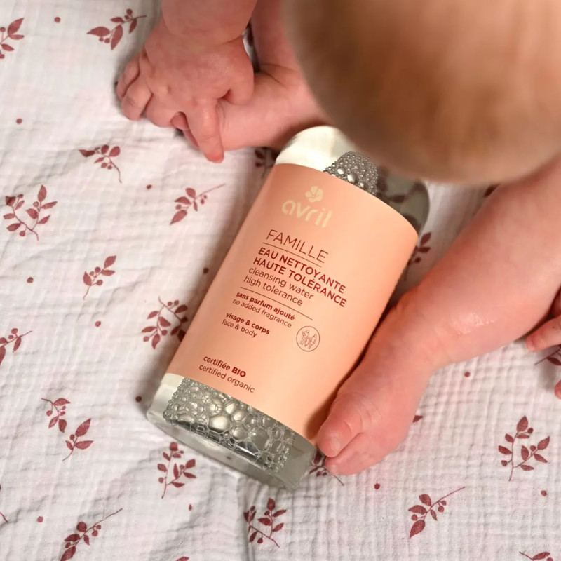 Une eau nettoyante haute tolérance BIO adaptée à toute la famille, formulée avec des ingrédients doux et hydratants pour nettoyer délicatement la peau tout en respectant son équilibre naturel, même sur les peaux sensibles.