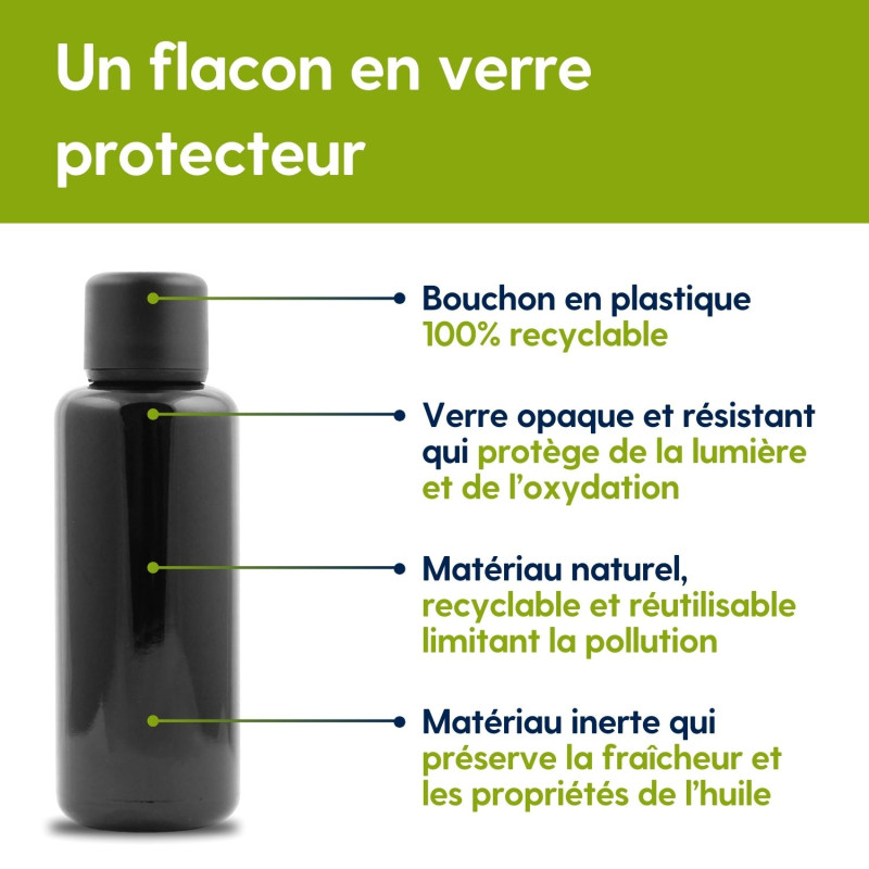 Le verre opaque, inerte et non poreux, constitue une barrière idéale contre la lumière et prévient toute interaction ou contamination avec le contenu. Contrairement à certains plastiques, il garantit la pureté de l’huile, tout en préservant l’efficacité de ses actifs. Ce choix s’inscrit également dans une démarche écologique durable, alliant protection du produit et respect de l’environnement.