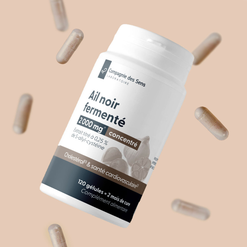 L’Ail noir (Allium sativum L.) est obtenu par fermentation contrôlée de bulbes d’ail, un procédé qui modifie profondément le profil biochimique initial et conduit à une accumulation de composés hydrosolubles spécifiques, en particulier la S-allyl-cystéine. Contrairement à l’ail frais, l’Ail noir présente une forme stabilisée et mieux biodisponible de certains composés soufrés, étudiés pour leurs interactions avec les mécanismes impliqués dans l’homéostasie cardiovasculaire. Sur le plan biochimique, les extraits d’Ail noir :
