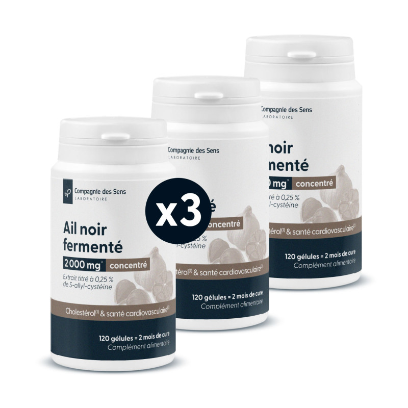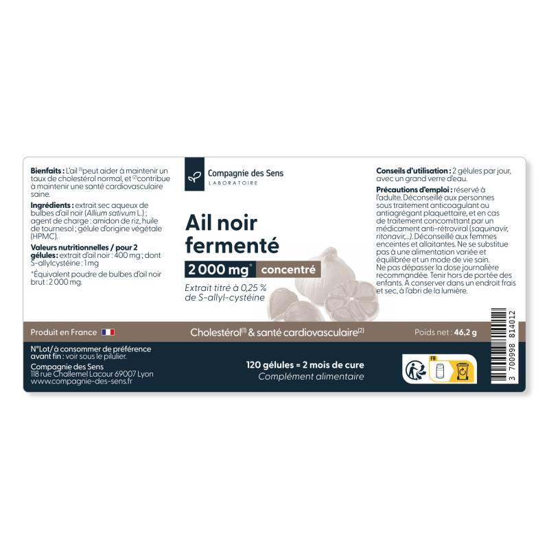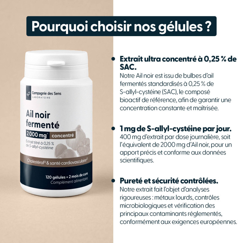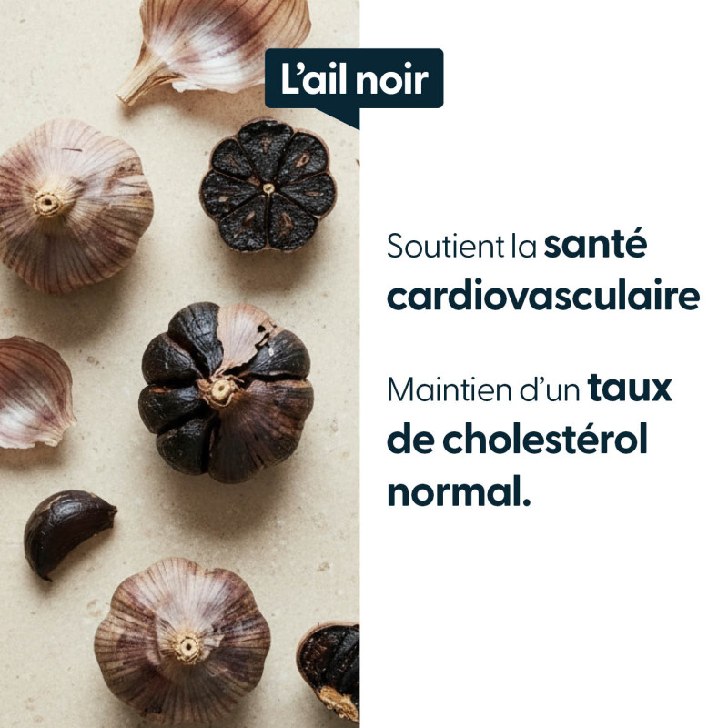 Cet extrait d'Ail noir concentré (Allium sativum L.) est issu de bulbes d'Ail fermentés. Il est standardisé à 0,25 % de S-allyl-cystéine (SAC), principal composé bioactif de l’Ail noir pour lequel la plante est utilisée en phytothérapie. Deux gélules apportent 400 mg d’extrait sec dont 1 mg de SAC, soit l'équivalent en actifs de 2000 mg de poudre brute d’Ail noir. Ce format garantit un apport maîtrisé et constant en S-allyl-cystéine. L'Ail noir soutient la santé cardiovasculaire et le maintien d’un taux de cholestérol normal.