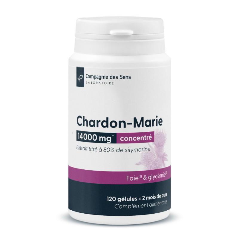 • Standardisation en silymarine : notre extrait de Chardon-Marie (Silybum marianum), issu des graines, est titré à 80 % de silymarine, le complexe actif de référence. Cette standardisation assure une teneur homogène et un apport maîtrisé.