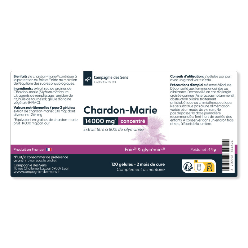 Cet extrait de Chardon-Marie (Silybum marianum) est standardisé à 80 % de silymarine, le complexe actif de référence impliqué dans la protection du foie et la gestion du stress oxydatif. Cette standardisation garantit une concentration élevée et constante en actifs. Chaque dose journalière apporte 330 mg d’extrait sec, dont 264 mg de silymarine, soit l’équivalent d’environ 14 000 mg de graines de Chardon-Marie standard. Ce niveau d’apport se situe dans la fourchette haute des dosages utilisés dans les études et permet une concentration réellement active.