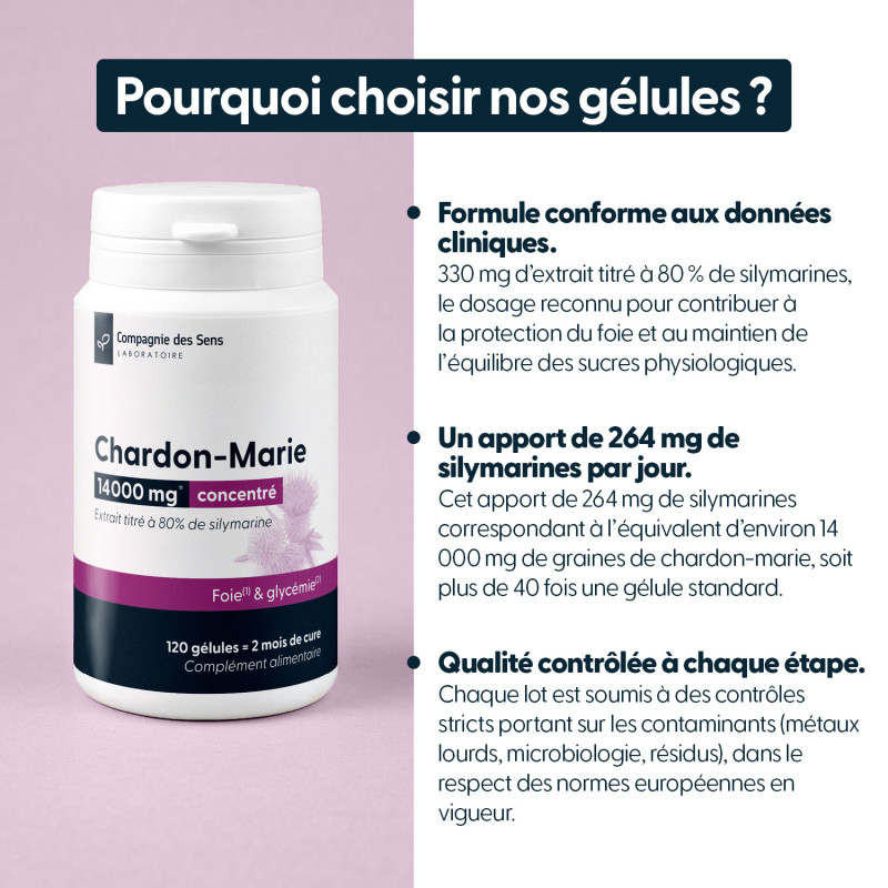 Pour garantir un effet réel, nous avons sélectionné un extrait de Chardon-Marie hautement concentré, titré à 80 % de silymarine. Chaque dose journalière fournit ainsi 264 mg de silymarine active — l’équivalent de près de 40 gélules de poudre standard. Ce concentré permet de réaliser une cure intensive en toute simplicité.