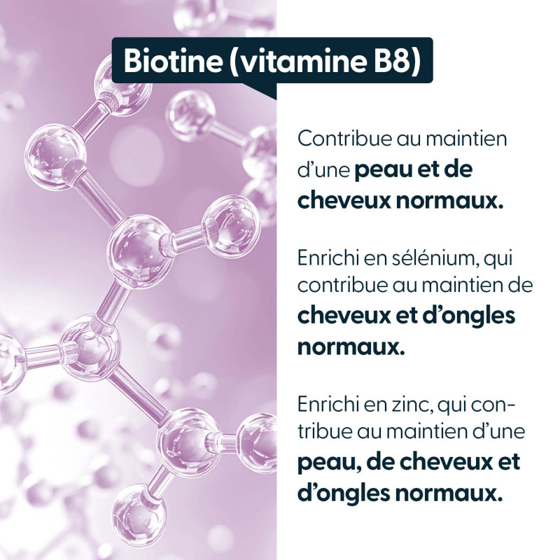 → La biotine contribue au maintien de cheveux normaux. En cas de chute de cheveux persistante ou inhabituelle, il est conseillé d’en identifier la cause avec un professionnel de santé.