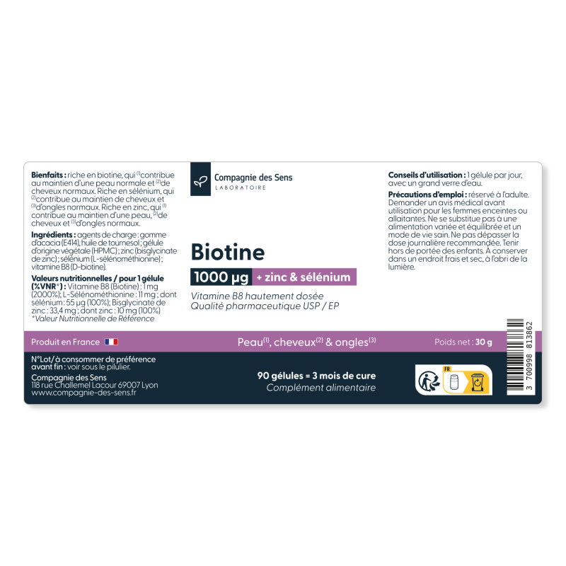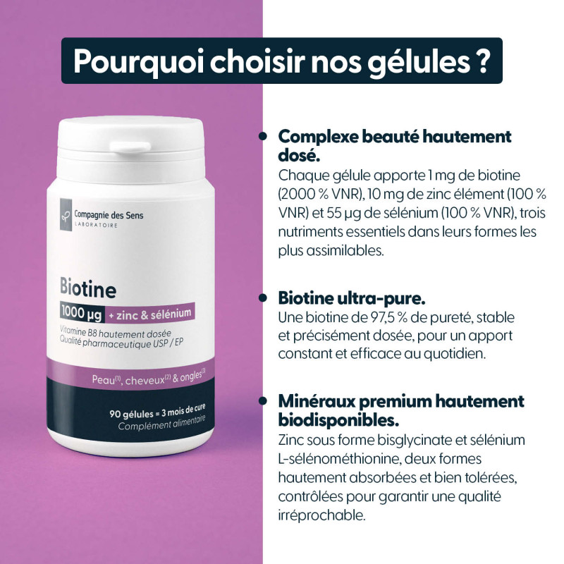 Ce complexe met en avant une biotine hautement dosée de qualité pharmaceutique USP / EP, associée au zinc et au sélénium, trois nutriments essentiels au maintien d’une peau, de cheveux et d’ongles normaux. Chaque gélule apporte 1000 µg de biotine, complétée par du zinc et du sélénium à hauteur de 100 % des valeurs nutritionnelles de référence, pour une action complète et équilibrée. Les formes sélectionnées assurent une bonne assimilation et une excellente tolérance. La formule est épurée, sans additifs superflus, encapsulée dans une gélule végétale et fabriquée en France.