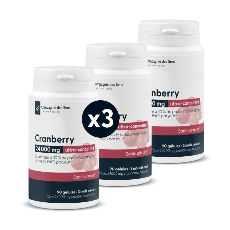 Cranberry 24 000 mg ultra-concentré est un complément alimentaire à base d'extrait sec hydroalcoolique de baies de canneberge (Vaccinium macrocarpon), titré à 30 % de proanthocyanidines (PACs). Chaque gélule apporte 72 mg de PACs, soit le double de la dose de référence retenue dans la littérature scientifique pour ses effets sur la santé urinaire, en une seule prise quotidienne. Le flacon de 90 gélules couvre une cure complète de 3 mois.