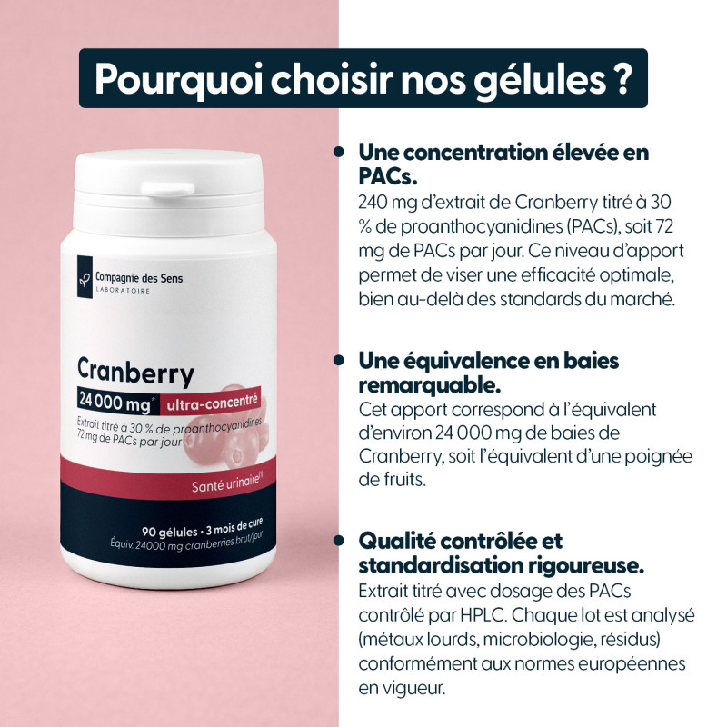 Sur le marché français, la majorité des produits à base de canneberge se positionnent autour du seuil minimal de 36 mg de PACs par jour, souvent atteint en 2 à 4 prises. Certains produits utilisent de la simple poudre de baies broyées ou du marc de canneberge, sans titrage garanti en PACs : la quantité réelle d'actif absorbée est alors inconnue et probablement insuffisante. Les produits les plus sérieux utilisent des extraits concentrés titrés entre 10 et 14 % de PACs, ce qui nécessite une gélule de 400 mg pour atteindre 36 à 56 mg de PACs. Le Cranberry Compagnie des Sens, titré à 30 % de PACs, atteint 72 mg en 240 mg d'extrait — soit une densité en actifs sans équivalent sur le marché.