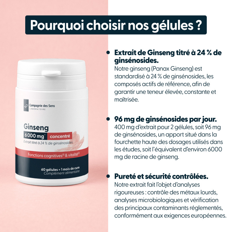 Notre ginseng est standardisé à 24 % de ginsénosides, les composés actifs responsables de ses effets. Ce niveau de titrage, supérieur aux standards du marché, permet de garantir une concentration élevée et constante en actifs.