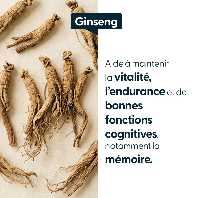 Le Ginseng contribue à soutenir la vitalité, à améliorer la résistance de l’organisme face au stress et à maintenir de bonnes performances physiques et cognitives, avec une action progressive favorisant une énergie plus stable dans le temps.
