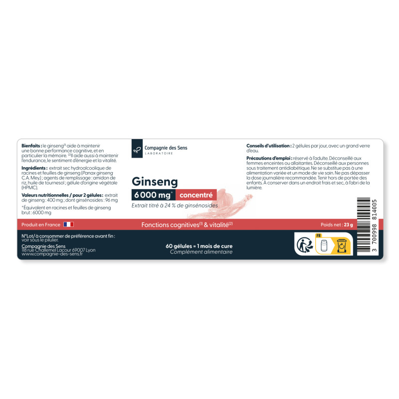 Cet extrait de Ginseng (Panax ginseng C.A. Mey.) est standardisé à 24 % de ginsénosides, garantissant un apport constant et maîtrisé en actifs. Deux gélules apportent 400 mg d’extrait sec dont 96 mg de ginsénosides, un dosage situé dans la fourchette haute des apports utilisés dans les études. Cette teneur en actifs est équivalente à environ 6000 mg de racines de ginseng brut.