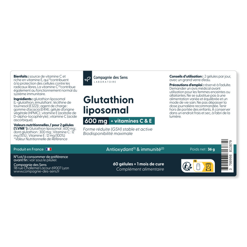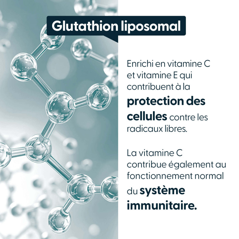 La formule associe le glutathion à la vitamine C (12 mg par dose journalière, soit 15 % des VNR) et à la vitamine E (12 mg par dose journalière, soit 100 % des VNR), deux antioxydants reconnus pour leur rôle complémentaire dans la protection cellulaire. La vitamine C participe notamment au maintien du glutathion sous sa forme réduite active (GSH), contribuant ainsi à préserver son efficacité biologique.