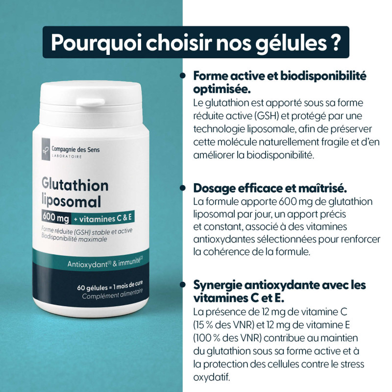 Pour répondre à cette limite, ce glutathion est apporté sous sa forme réduite active (GSH), la seule forme biologiquement fonctionnelle, directement impliquée dans les mécanismes antioxydants et l’équilibre cellulaire. La technologie liposomale permet de protéger cette forme active, naturellement fragile, et d’en améliorer la biodisponibilité, afin de favoriser une meilleure disponibilité pour l’organisme. Cette approche associe ainsi forme active et technologie de protection, pour un glutathion mieux préservé et plus facilement utilisable par l’organisme.