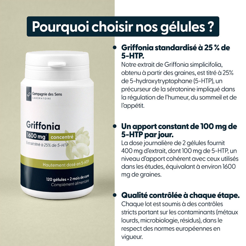 Cet extrait de Griffonia (Griffonia simplicifolia) est standardisé à 25 % de 5-HTP, le précurseur direct de la sérotonine, impliquée dans la régulation de l’humeur, du sommeil et de l’appétit. Cette standardisation garantit une concentration élevée et constante en actif. Deux gélules apportent 400 mg d’extrait sec dont 100 mg de 5-HTP, soit l’équivalent d’environ 1600 mg de graines de griffonia. Ce dosage permet un apport précis et cohérent avec la littérature scientifique.