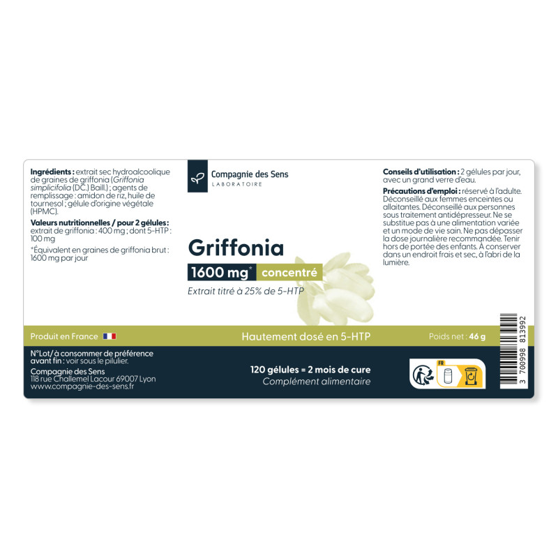 Extrait sec hydroalcoolique de graines de griffonia (Griffonia simplicifolia (DC.) Baill.) ; agents de remplissage : amidon de riz, huile de tournesol ; gélule d'origine végétale (HPMC).