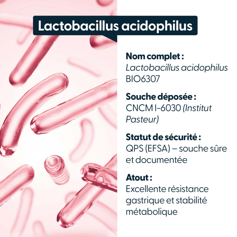 Notre Lactobacillus acidophilus est une souche identifiée, séquencée et déposée à l’Institut Pasteur sous le numéro CNCM I-6030, garantissant une traçabilité complète et une sécurité maîtrisée. Produite sous le code BIO6307, cette souche bénéficie du statut QPS de l’EFSA et d’un contrôle qualité rigoureux incluant l’absence de gènes de résistance et de virulence. Concentrée à 200 milliards d’UFC/g, elle apporte 15 milliards d’UFC par gélule. Nos souches sont protégées par une gélule HPMC gastro-résistante, assurant une excellente survie digestive. Une formule unitaire ultra dosée, ciblée et d’une qualité irréprochable.
