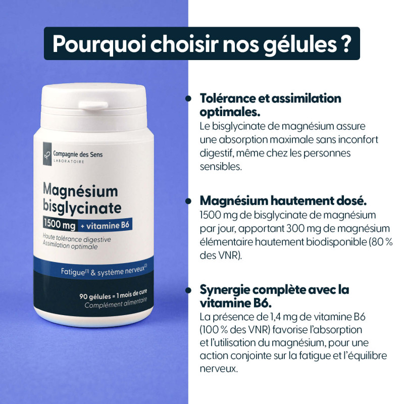 → Même si le magnésium bisglycinate est très bien toléré, un excès ponctuel peut entraîner un léger effet laxatif sans danger. Nous recommandons donc de respecter les dosages conseillés.