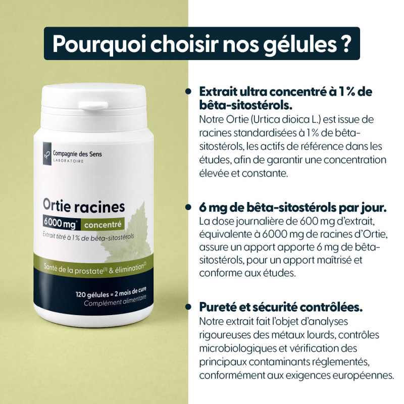 Cet apport est rendu possible par un extrait standardisé à 1 % de bêta-sitostérols, les actifs de référence des racines d’Ortie. Le titrage est contrôlé par analyse, garantissant une teneur élevée, stable et reproductible d’un lot à l’autre, en cohérence avec les extraits utilisés dans les études scientifiques.
