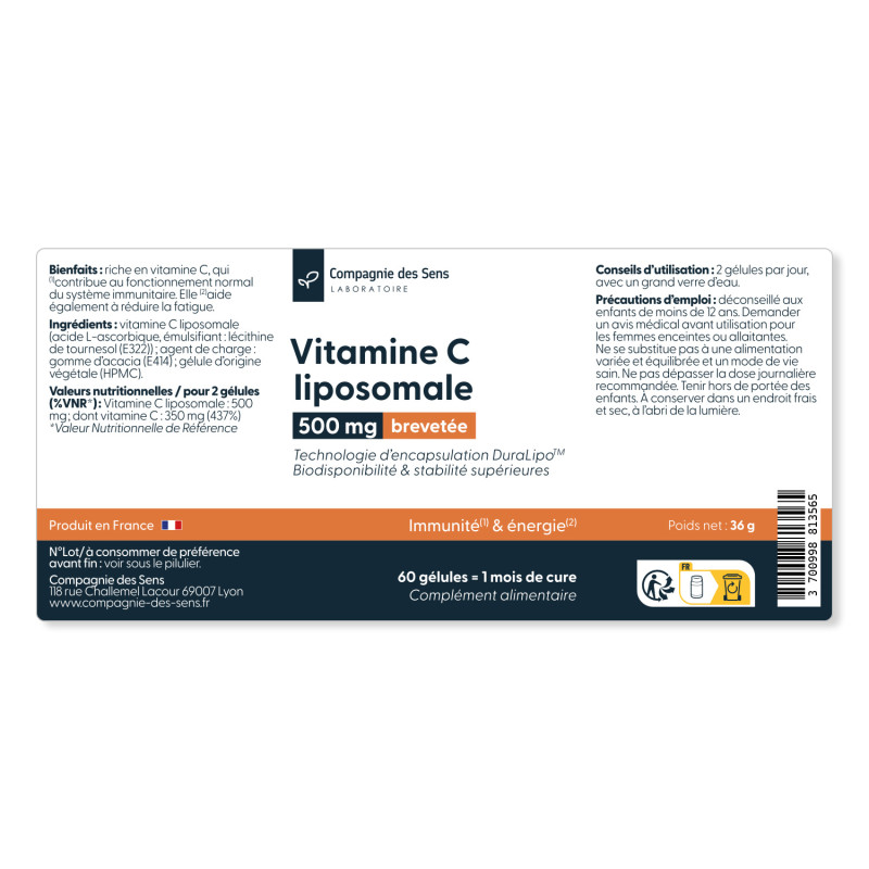 Notre Vitamine C liposomale est composée à 70 % de vitamine C pure qui contribue au bon fonctionnement des défenses naturelles tout en protégeant les cellules contre le stress oxydatif. Sa technologie liposomale brevetée DuraLipo™, obtenue par encapsulation dans des phospholipides de tournesol, améliore nettement l’absorption intestinale et la stabilité de la vitamine. Deux gélules apportent 350 mg d’acide L-ascorbique, soit 437 % des valeurs nutritionnelles de référence (VNR).