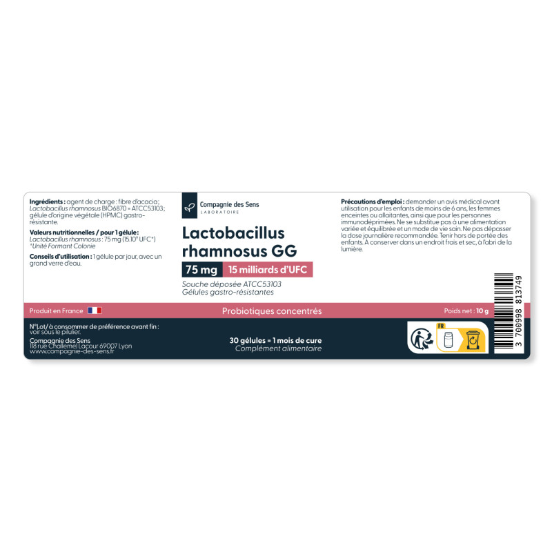 Lactobacillus rhamnosus GG est l’une des souches probiotiques les plus utilisées en complémentation. Identifiée sous la référence ATCC 53103, elle est très documentée pour son intérêt sur le maintien des jonctions serrées de la barrière intestinale, évitant toute molécule indésirable de rentrer dans la circulation sanguine. Elle soutient également la diversité microbienne, un paramètre reconnu comme essentiel au bon fonctionnement de l'immunité. Certains résultats suggèrent enfin une influence indirecte sur les systèmes de protection des voies respiratoires, via la communication entre le microbiote intestinal et les mécanismes de défense de l’hôte. Chaque gélule de notre Lactobacillus rhamnosus GG apporte 15 milliards d’UFC, dans une forme gastro-résistante permettant à la souche d’atteindre efficacement l’intestin.