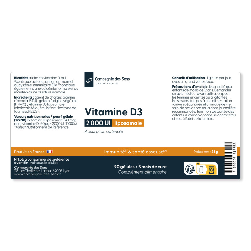 La vitamine D3 joue un rôle essentiel dans le soutien des défenses naturelles. Grâce à son encapsulation dans des phospholipides de tournesol, notre Vitamine D3 liposomale améliore l’absorption du cholécalciférol et assure une stabilité optimale de la formule. Chaque gélule fournit 50 µg, soit 2000 UI de vitamine D3, correspondant à 1000 % des valeurs nutritionnelles de référence.