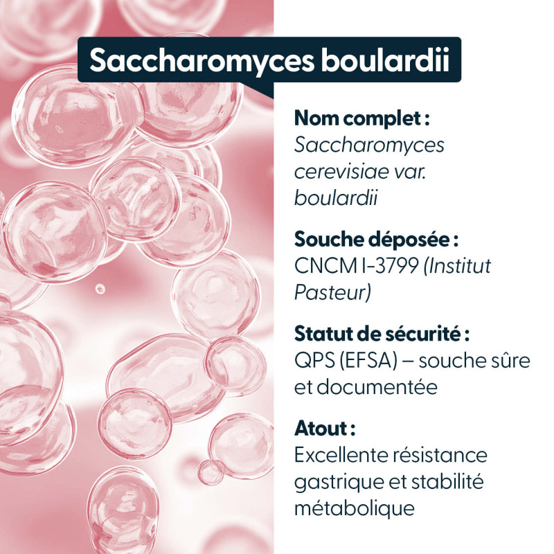 La souche CNCM I-3799 est également connue pour produire des composés bioactifs capables de neutraliser certaines molécules indésirables et de soutenir les défenses naturelles de la muqueuse digestive. Ces actions contribuent à préserver l'environnement digestif, notamment lors de périodes où l’équilibre du microbiote est mis à l’épreuve (changement d’alimentation, voyages, routines perturbées ou prise de certains traitements).