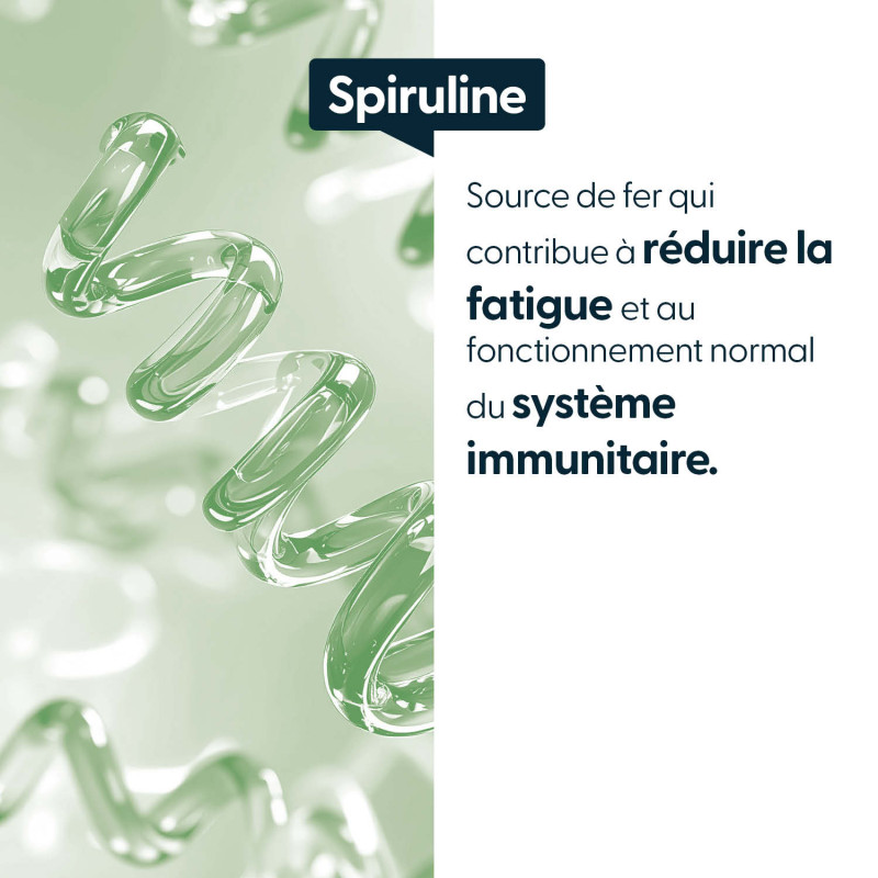 La poudre de Spiruline utilisée pour obtenir les comprimés est source de fer. 6 comprimés pris quotidiennement apportent 3,69 mg de fer ce qui représente 26 % des apports journaliers recommandés en fer. À savoir que le fer contribue notamment à réduire la fatigue. Le fer participe aussi à la formation normale des globules rouges et de l’hémoglobine, et au transport normal de l’oxygène dans le sang. À savoir que le fer de la Spiruline est un fer non-héminique très bien assimilé par l’organisme contrairement à d’autres végétaux. Pour optimiser son absorption, il peut être judicieux de l’associer avec des produits riches en vitamine C. De plus, les comprimés de Spiruline de la Compagnie des Sens contiennent également de la chlorophylle (35,37 mg pour 6 comprimés) jouant un rôle essentiel sur la production d’hémoglobine en s’associant au fer. Ce pigment végétal possède également des vertus anti-fatigue.