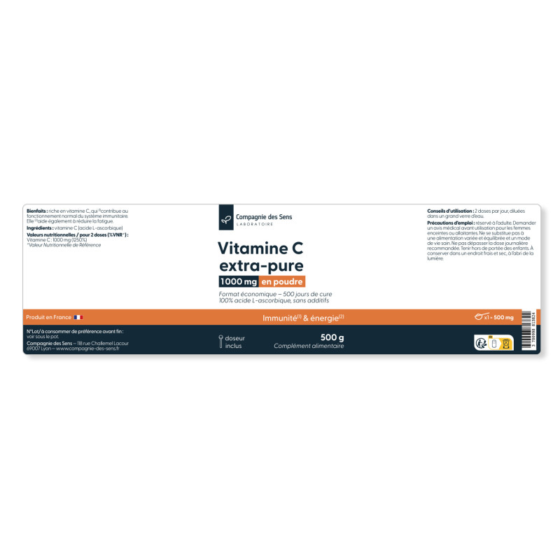 Proposée sous forme de poudre, cette vitamine C permet d’adapter facilement l’apport quotidien en fonction des besoins. Deux doses de 500mg apportent 1000 mg de vitamine C, soit 1 250 % des Valeurs Nutritionnelles de Référence (VNR), offrant une supplémentation concentrée et maîtrisée.