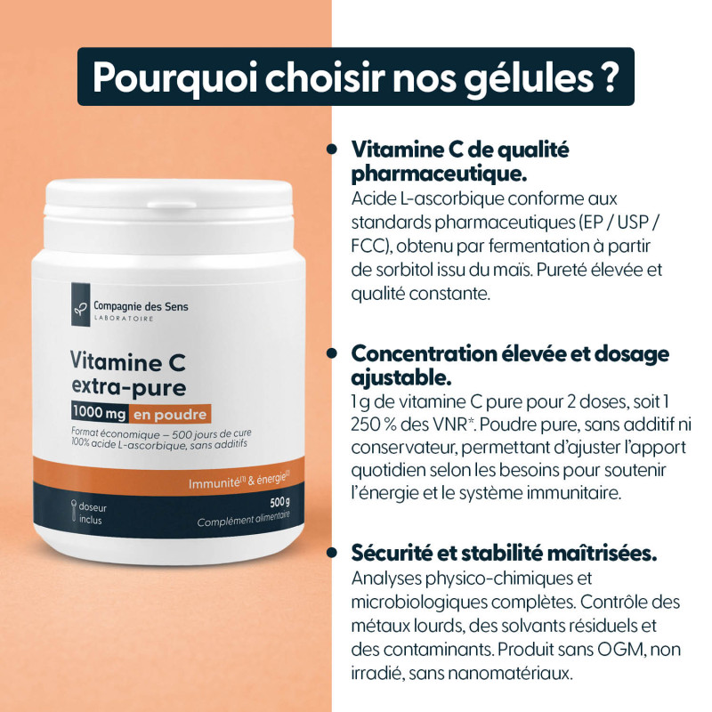→ La vitamine C en poudre est composée d’acide L-ascorbique pur, facilement dosable et modulable, permettant d’ajuster précisément l’apport quotidien.