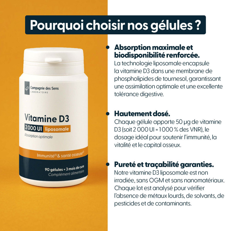 Notre vitamine D3 liposomale apporte 2000 UI par gélule, soit 1000 % des VNR. Encapsulée dans des phospholipides issus de la lécithine de tournesol, cette forme favorise une assimilation optimisée. Elle offre une manière simple et efficace de soutenir le fonctionnement normal du système immunitaire et le maintien d’une ossature solide. Cette cure de 3 mois propose le dosage idéal pour compenser les baisses saisonnières ou un manque d’exposition au soleil, avec une gélule pratique et une formule courte, sans superflu.