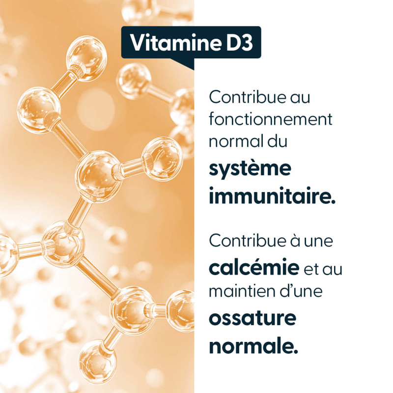Agent de charge : gomme d’acacia (E414) ; gélule d’origine végétale ; vitamine D3 liposomale (cholécalciférol extrait de lanoline, émulsifiant : lécithine de tournesol (E322)).