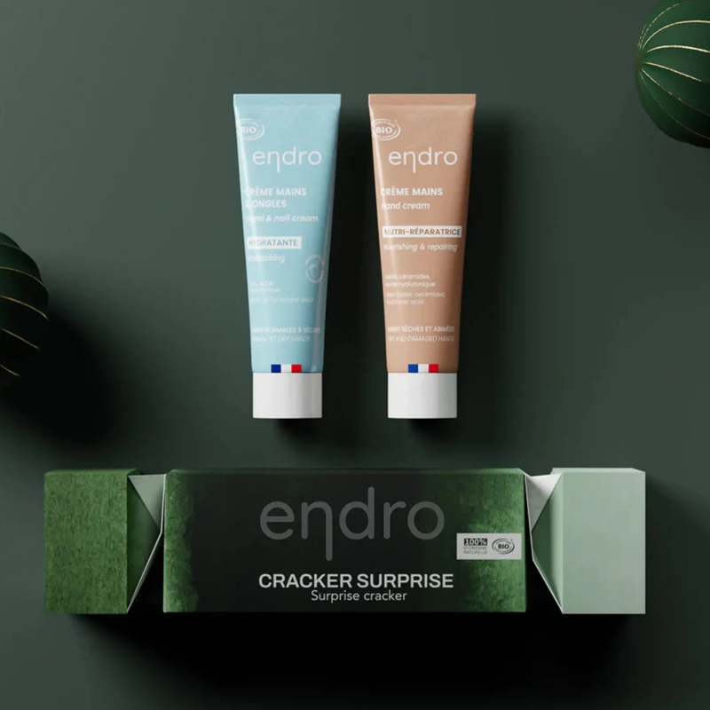 Ce cracker surprise de Noël Endro® en édition limitée renferme deux crèmes mains BIO : une crème hydratante et une crème nourrissante. Ensemble, elles offrent une routine complète pour apaiser, réparer et protéger les mains sèches, abîmées ou sensibilisées par le froid.
