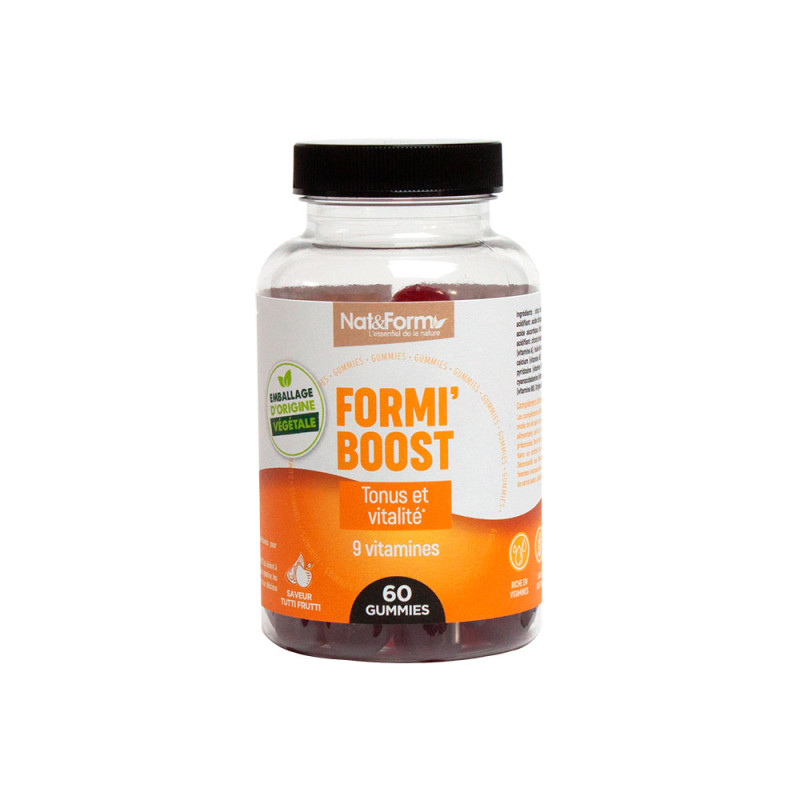 Les gummies Formi'Boost de Nat&Form réunissent 9 vitamines dans une formule conçue pour soutenir le tonus et réduire la fatigue au quotidien. Cinq d'entre elles (C, B5, B6, B9 et B12) contribuent directement à réduire la fatigue, tandis que les vitamines A, D, E et B8 complètent le spectre pour couvrir les fonctions immunitaires, antioxydantes et métaboliques essentielles. Le format gummy sans gélatine, saveur tutti frutti, rend la prise simple et agréable.