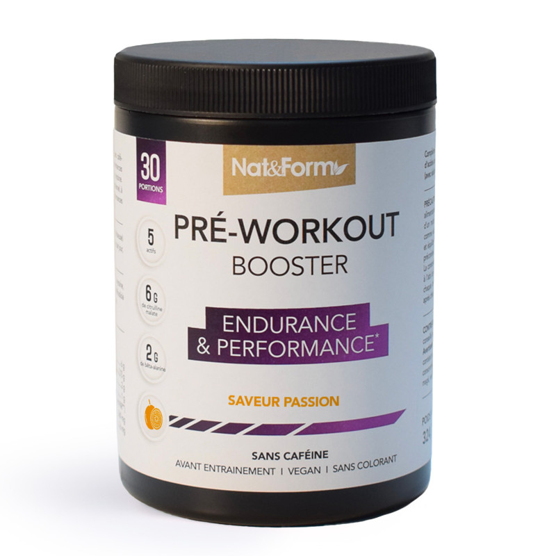 Le Pré-Workout Booster de Nat&Form est un complément alimentaire en poudre qui associe cinq actifs complémentaires — L-citrulline malate, bêta-alanine, L-tyrosine, magnésium et rhodiola — pour préparer l'organisme à l'effort. Son angle distinctif : une formule entièrement sans caféine, conçue pour soutenir l'énergie, la concentration et l'endurance musculaire sans stimulant du système nerveux central. Disponible en deux saveurs fruitées et acidulées (Fruits Rouges, Passion), à diluer dans 300 ml d'eau 30 minutes avant la séance.