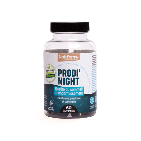 Les Gummies Prodi'Night de Nat&Form sont un complément alimentaire dédié au sommeil, formulé autour d'un quatuor d'actifs complémentaires : mélatonine, passiflore, camomille allemande et mélisse. La formule associe 1 mg de mélatonine par prise (dosage validé pour réduire le temps d'endormissement) à trois extraits de plantes traditionnellement utilisés pour la relaxation et la qualité du sommeil. Le tout se présente sous forme de gummies sans gélatine, au goût framboise.