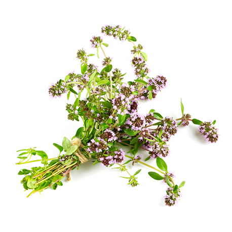 Le Thym, également connu sous le nom latin Thymus vulgaris, est un arbrisseau vivace appartenant à la famille des Lamiacées. Originaire du bassin méditerranéen, ses feuilles et tiges sont comestibles. Les fleurs sont petites, bilabiées, et d'un rose vif. Elles sont très attractives pour les abeilles, et sont regroupées en épis terminaux globuleux. Depuis l'Antiquité, les Égyptiens utilisaient cette plante pour l'embaumement des corps, tandis que les Grecs l'offraient en brûlant, bénéficiant de son parfum naturellement agréable dans leurs temples. Le Thym est une plante aromatique réputée à la fois en cuisine, et pour ses nombreuses propriétés bénéfiques, liées à sa concentration élevée en huile essentielle.
