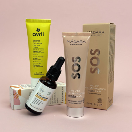 Cette routine complète associe l’Huile de soin Clémence & Vivien, un concentré d’huiles végétales nourrissantes et réparatrices, à la Crème de Jour peaux sèches Avril, légère et riche pour nourrir et hydrater au quotidien. En soin intensif, le Masque hydratant éclat Mádara complète le rituel en profondeur, en gorgeant la peau d’eau et en révélant son éclat naturel. Un trio essentiel pour retrouver une peau nourrie, rebondie et lumineuse chaque jour. Ces trois produits sont enrichis en actifs naturels et sont certifiés Cosmos Organic.