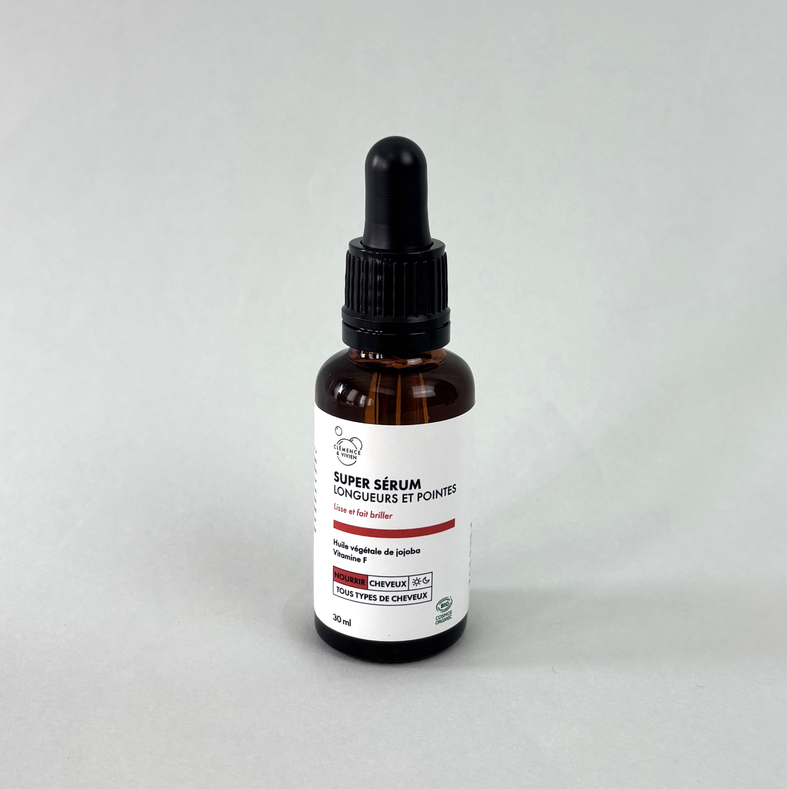 Le Super Sérum Longueurs et Pointes est le soin idéal pour redonner douceur, éclat et souplesse aux cheveux secs, cassants ou ternes. Certifié BIO et formulé à 100 % d’ingrédients naturels, il combine la puissance de trois huiles végétales nourrissantes en synergie pour hydrater intensément la fibre capillaire.