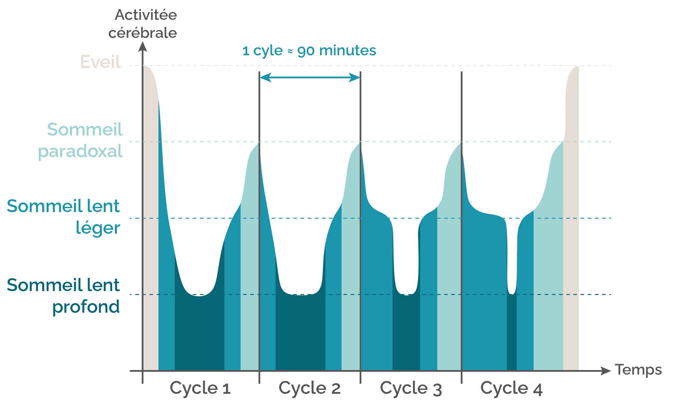 Ces 3 phases s’enchaînent tout au long de la nuit et forment des cycles de 90 minutes environ, qui se succèdent 4 à 6 fois : sommeil lent léger - sommeil lent profond - sommeil lent léger - sommeil paradoxal - sommeil lent léger etc. Le sommeil lent profond est prédominant pendant la première moitié de la nuit, puis celui-ci laisse plus de place aux sommeils lent léger et paradoxal. Les cycles du sommeil évoluent et fur et à mesure de la vie, et le sommeil profond peut facilement être troublé par divers évènements, et ce dès l’adolescence. Le manque de sommeil profond provoque alors les mêmes troubles que les insomnies : irritabilité, troubles de la concentration, de la mémorisation, augmentation du risque d’anxiété voire obésité, diabète ou maladies cardio-vasculaires.