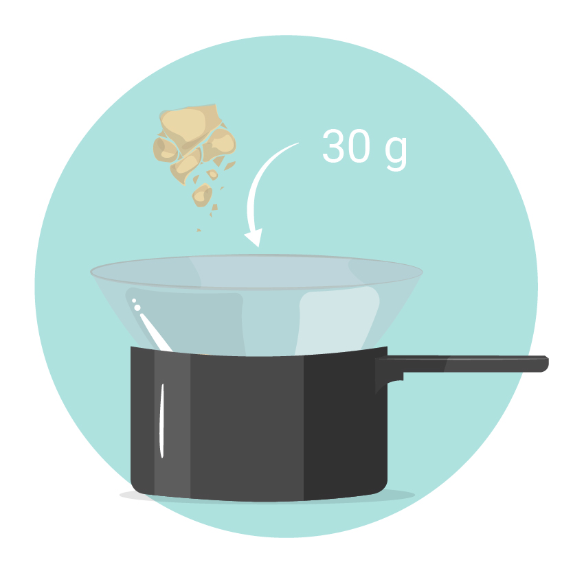 Après avoir prélevé la quantité nécessaire de beurre de karité, faites-le fondre doucement au bain-marie (avec une eau entre 35 et 40°). Cette étape peut prendre entre 2 et 5 min.