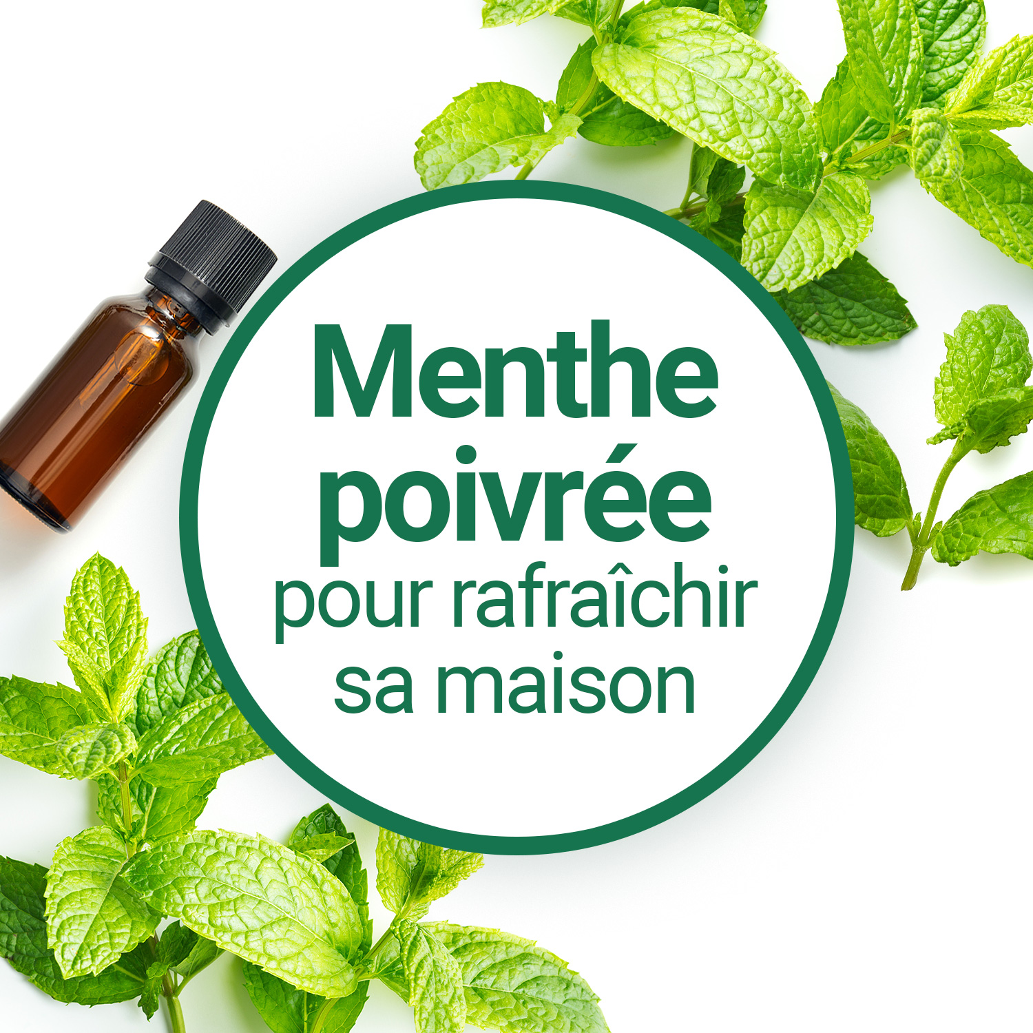 Si l’huile essentielle de Menthe Poivrée est utilisée dans la maison, c’est bien pour son parfum rafraîchissant particulièrement apprécié. Cette odeur mentholée typique est due à sa forte teneur en menthol (jusqu’à 50 %). Mais cette molécule de la famille des monoterpénols a d’autres propriétés plus qu’intéressantes. Antibactérien, antiviral, antifongique, le menthol contenu dans la Menthe Poivrée contribue à purifier l’air de la maison. Sur les textiles et autres surfaces, il aura donc une action désinfectante, en plus d’apporter une odeur agréable. Mais l’huile essentielle de Menthe Poivrée n’est pas la seule à pouvoir être utilisée pour l’entretien de la maison. À associer au gré des envies avec d’autres huiles essentielles comme les agrumes pour varier les plaisirs et les senteurs, toujours en respectant les dosages !