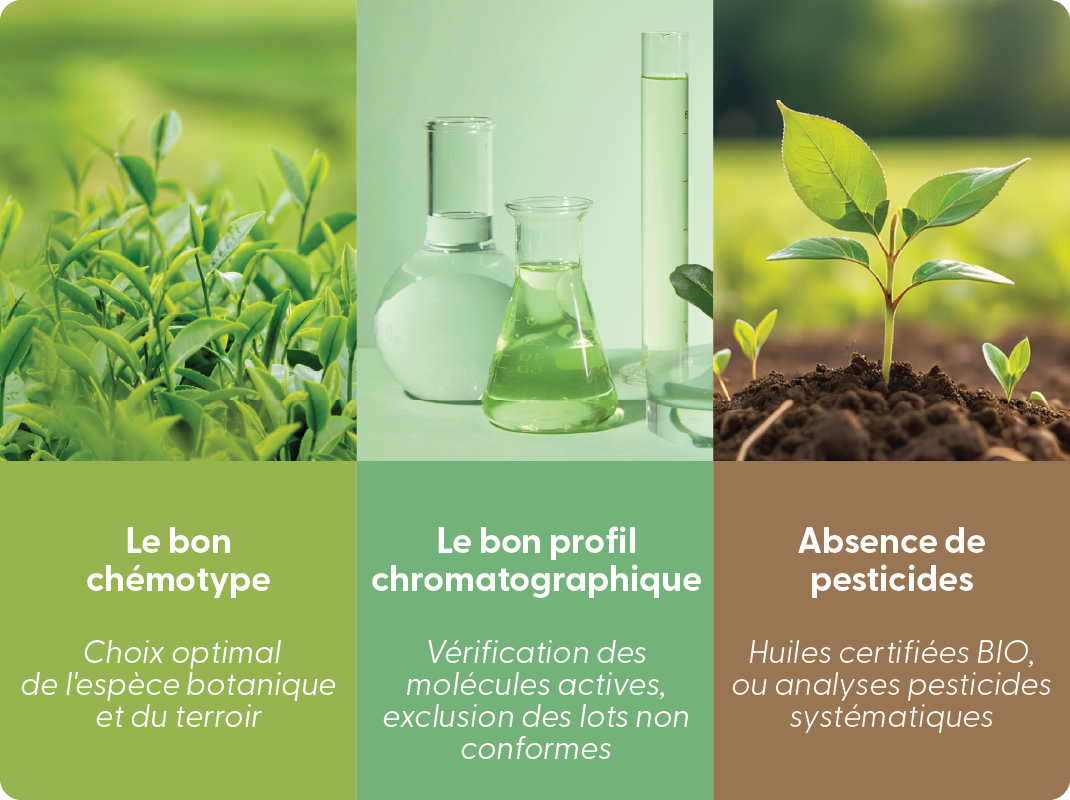 Les huiles essentielles ont de nombreux usages et autant de profils qualité. Choix de la plante, terroir, conditions de culture, climat, qualité de l’extraction : autant de facteurs impactant la composition des huiles essentielles. Pour un usage en phyto-aroma, cohérent avec la recherche scientifique et la documentation disponible (comme cette page), il est essentiel d’utiliser une huile essentielle rigoureusement sélectionnée dans ce but. C’est une question d’efficacité, mais aussi de sécurité. Pour cela, assurez-vous d’avoir :